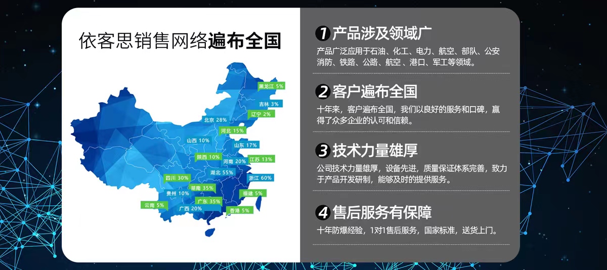 依客思防爆專注于防爆產品的研發(fā)、生產與銷售,主要產品有:防爆操作柱、BXCQ防爆靜電釋放儀、BZC系列防爆操作柱、不銹鋼現場操作箱、BXM(D)防爆照明(動力)配電箱、BXX防爆檢修箱、BXJ防爆接線箱、LED防爆燈、防爆管件、防爆風機等產品,型號規(guī)格齊全,廣泛適用于煤炭、電力、醫(yī)藥、石油、化工、航空等領域。我公司產品質量過硬,價格實惠,銷售范圍廣,且與各大型企業(yè)建立了良好的合作關系,同時還遠銷中、東亞和北美等地區(qū),深受用戶喜愛與青睞。